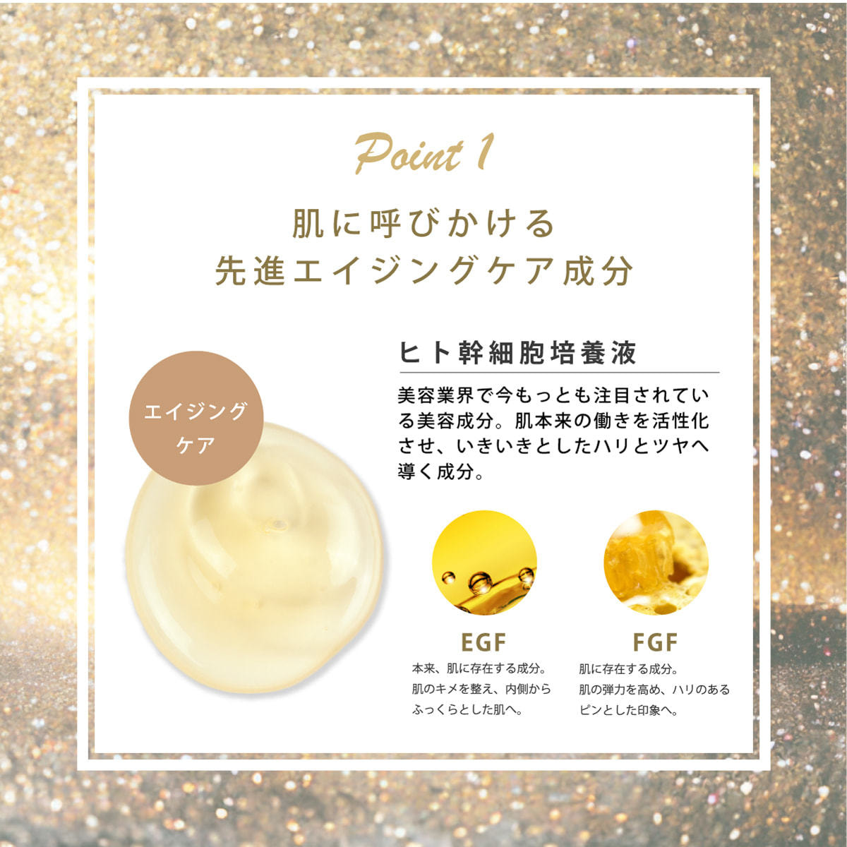 2種類のヒト幹細胞培養液*1をはじめ、EGF*2、FGF*3、フラーレン*4、3種のヒト型セラミド*5など先進の美容成分をギュッと配合。